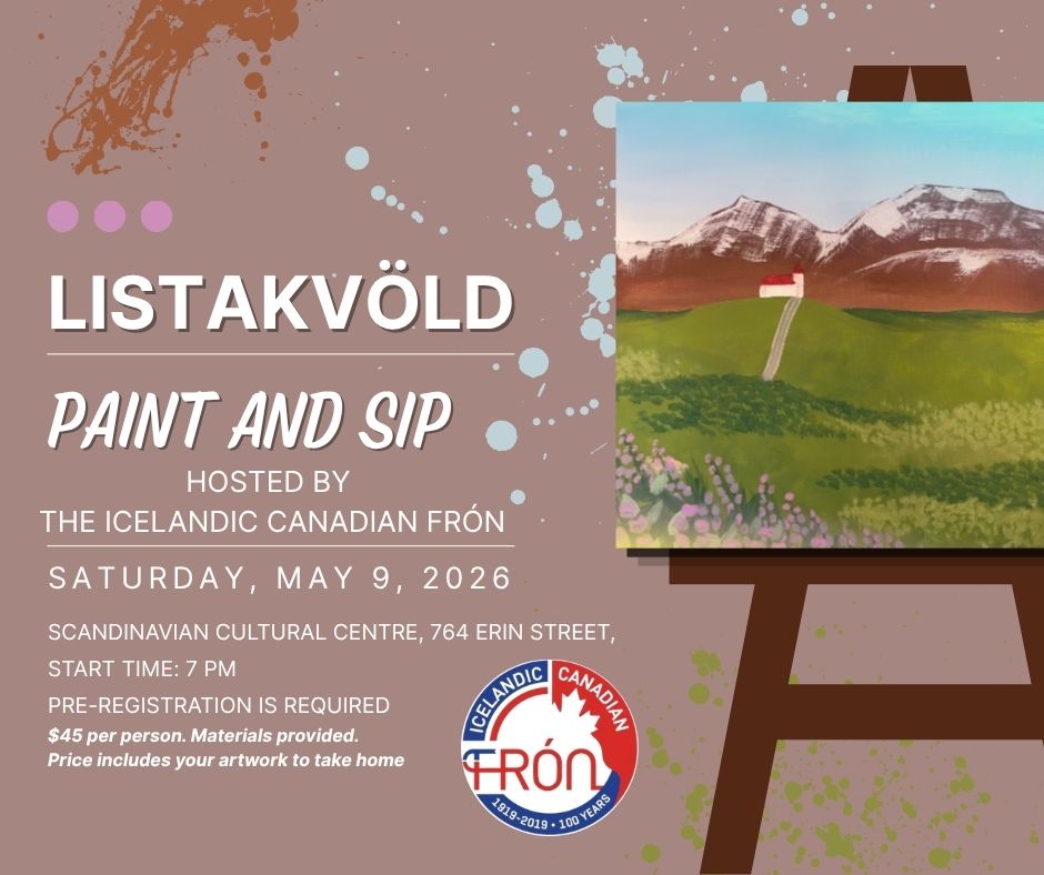 IT IS BACK!!! Paint and Sip Night with the Icelandic Canadian Frón!Join us on Saturday, May 9th at 7:00 PM at the Scandinavian Cultural Centre for a relaxing evening of creativity and connection. The bar will be a cash bar so you can enjoy a glass of wine or beverage while you paint your very own … Continue reading Paint and Sip Night